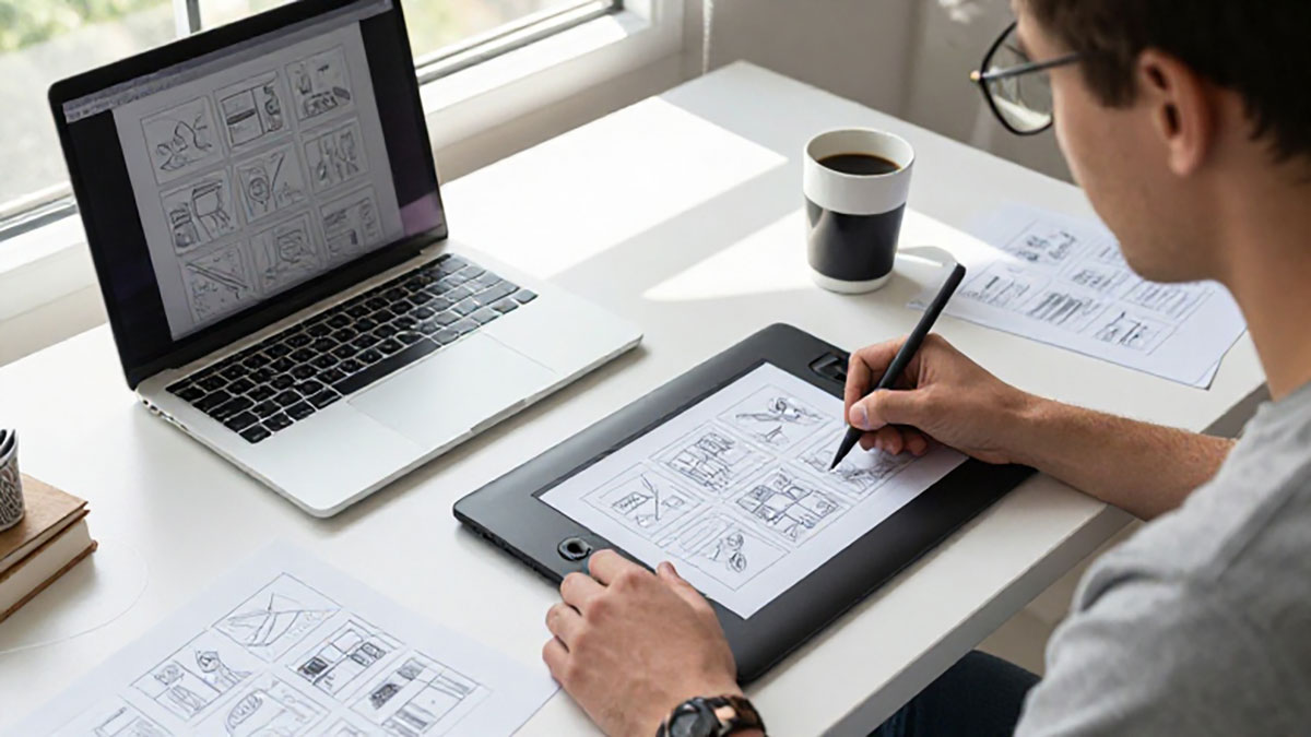 Untuk membuka jasa storyboarding, Anda perlu menguasai beberapa keterampilan dasar. Kemampuan menggambar atau ilustrasi digital menjadi modal utama, baik menggunakan tablet grafis maupun software desain seperti Adobe Photoshop, Illustrator, atau Procreate. Kreativitas dalam menyusun alur cerita dan kemampuan memahami konsep pemasaran juga sangat penting karena storyboard yang efektif harus mampu menyampaikan pesan iklan secara jelas dan menarik. Selain itu, kemampuan komunikasi yang baik akan membantu Anda berinteraksi dengan klien, menerima brief, dan menyesuaikan storyboard sesuai kebutuhan mereka.